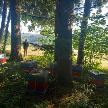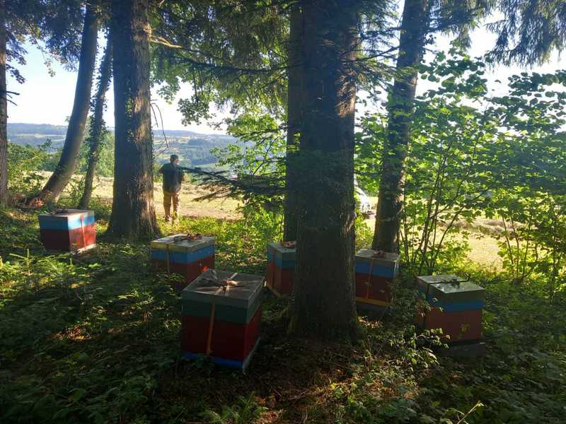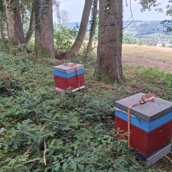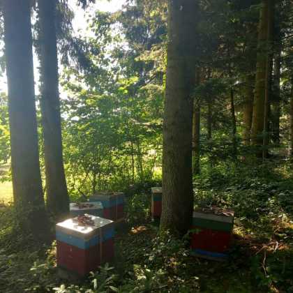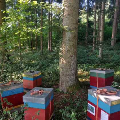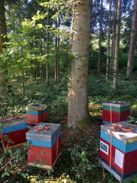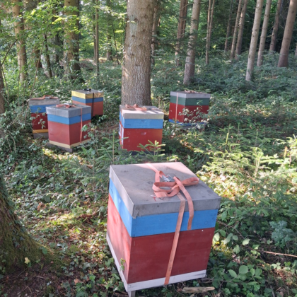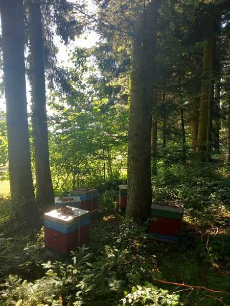 Angekommen ... am mit dem Besitzer ausgesuchten und abgesprochenen Waldstück ... laden wir unsere Völker ab ... und sind... wieder Mal... froh, voller Hoffnung ... Der Ort, an dem es honigen wird (?) ist für uns gut erreichbar, so dass wir die Völker nicht wochenweise aus den Augen verlieren. Und es ist ein wunderbarer Platz mit einer schönen Aussicht über das im Tal gelegene Urnau. Ob die Bienen das zu danken wissen ...