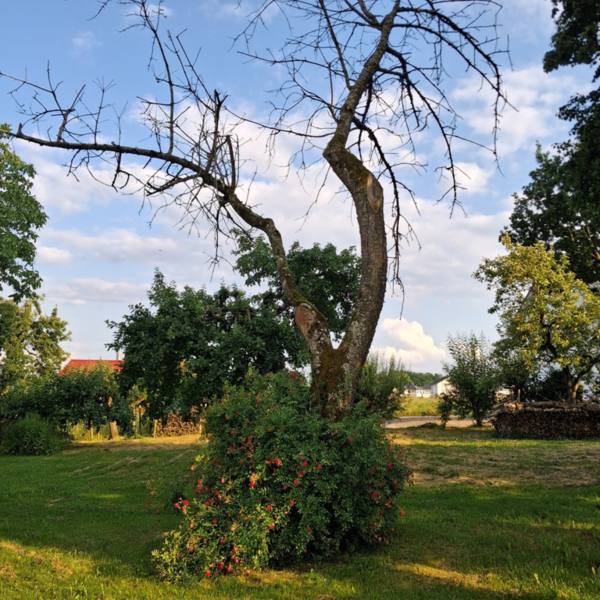 Rote Rosen und Bienenwachszylinder vor dem abgelebten Kirschbaum...