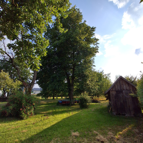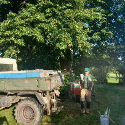 Vom Tagwerk: Obstgarten: Mähen, 1. Schnitt. Ausmähen um die Bäume und Sträucher. Und um die Bienenkästen.