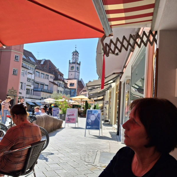 Photostrecke: Goldbrunnen. ...///...Kaffeepause in Ravensburg: Das schmale Haus auf dem Gspinstmarkt. Und, der Esel, das Symbol der Ravensburger Handelsgesellschaft: Frisst er schon Blätter? ... die Ladenleerstände nehmen zu ... Stockwaage: Abnahme.
