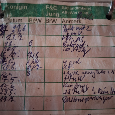 3) Umweiselung. Zu alte Königinnen (23'er Jahrgang) und weniger leistungsfähige werden ausgetauscht durch 25'er K'en.
