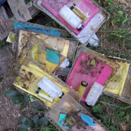 Im Feldmooser Wald: Nach ca. 10 Tagen (Witterung mit Dauerregen)können die Verdunster, unter dem Futtertrog, abgenommen werden. Dieses Jahr haben wir, nach dem lang andauernden Regen, zwei Mal mit 30 ml AS nachgelegt, bei sonnigem Wetter. Angesichts des Einsatzes des Langzeitverdunster's während des Dauerregens zweifelten wir an der Wirksamkeit der Behandlung: Verdunstungsrate? Hohe Luftfeuchtigkeit. Volk bildet Traube, schottet sich ab?